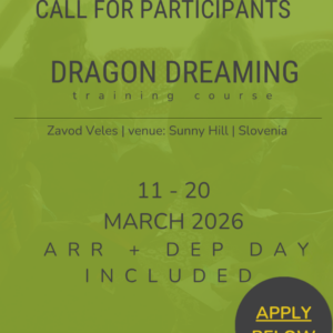 Dragon Dreaming Training in Slovenia CALL FOR PARTICIPANTS DRAGON DREAMING TRAINING COURSE application deadline 10th of January >>Click ... 11 Mar All Day Sunny HillSlovenia